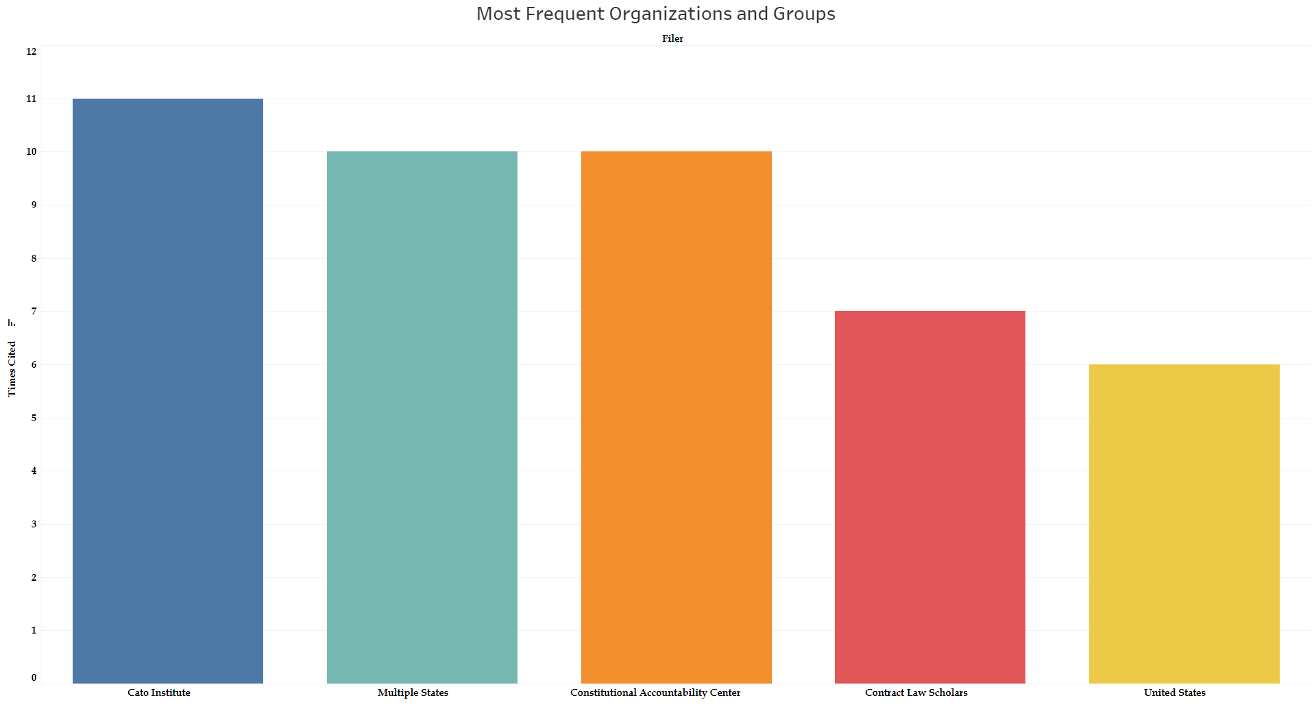 The Cato Institute led the way for the 2018 term, with 11 unique cites picked up by the justices. This was followed by cites found in amicus briefs signed by multiple states as well as those from the Constitutional Accountability Center, which each were responsible for 10 unique cites. A brief by Contract Law Scholars in Lamps Plus v. Varela conveyed seven unique cites. The United States was responsible for six unique cites across its amicus briefs for the 2018 term.