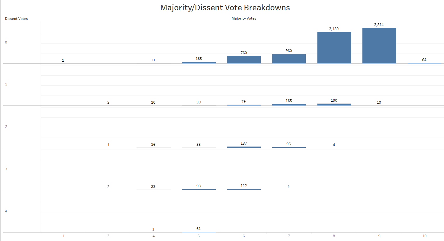 As is evident from the chart, the disparity between decisions with unanimous votes and those with four dissents shows that the justices were much more averse to dissenting in the court’s first 100 years or so.