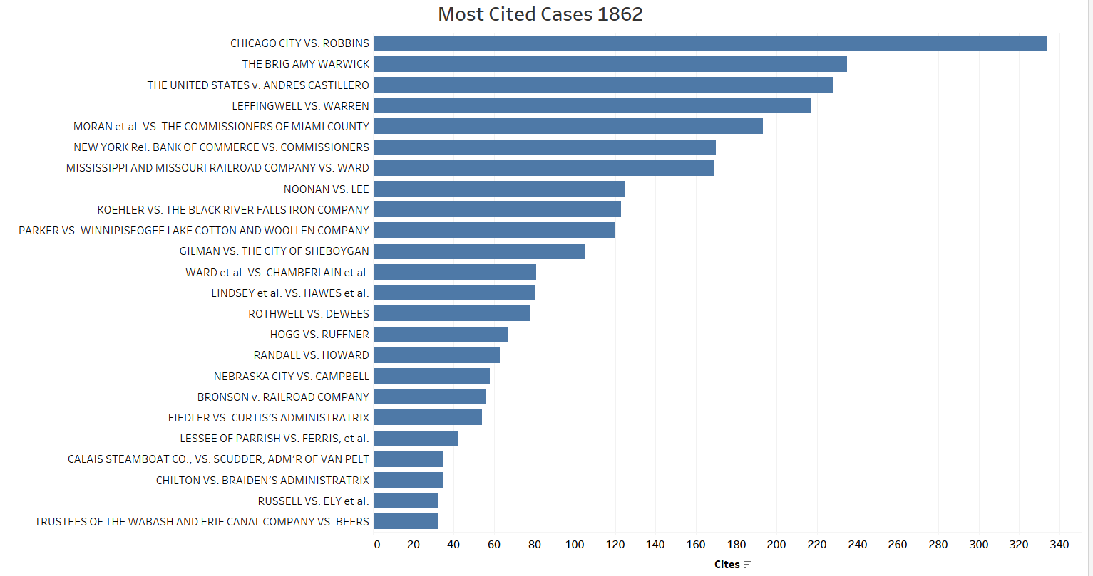 Another way to examine the cases in these terms is by citation counts. In 1862, the case with the most subsequent citations, Chicago City v. Robbins, has been cited in 334 combined state and federal court opinions. The figure below shows all decisions from the 1862 term cited in at least 30 court opinions.