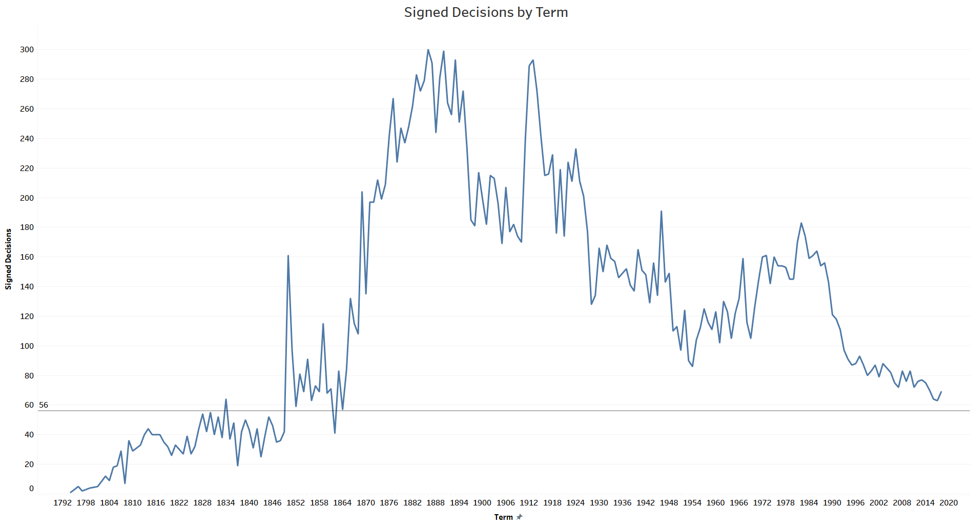 The Civil War was fought between 1861 and 1865, and the Supreme Court was affected by the war like all national institutions. During the second year of the war in 1862, the court decided 41 cases by signed decisions, and in 1864 the court decided 57 such cases. According to the U.S. Supreme Court Database, these were the fewest decisions the court had rendered in any year since 1849. If the Supreme Court decides all the cases already argued this term along with the additional cases slated for argument in May by signed decisions, the number of decisions for OT 2019 will reach 56. Even with several recent terms in which the justices’ opinion output dipped to historic lows, 56 signed decisions would be the fewest since 1862, and, aside from the blip due to the Civil War, the fewest since 1849.