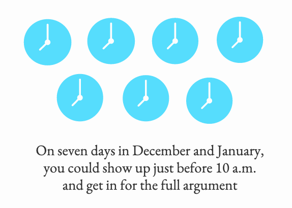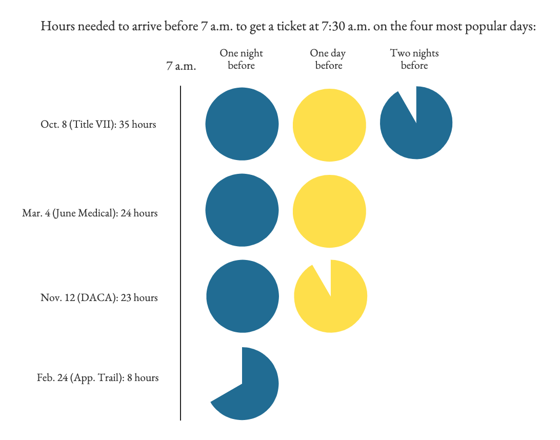 If your goal is simply to see the Supreme Court in action, and you have some flexibility in your schedule, our data shows that it is possible to do without spending long hours on the sidewalk, as long as you are willing to brave rainy or wintry weather and skip the high-profile arguments. But many people want to go to the Supreme Court to see a particular argument, because the case presents an issue that they have a connection to. And seats for those cases, as the stories we have collected this term suggest and the data bears out, can often be significantly harder to obtain.