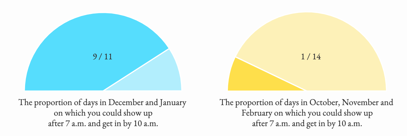 The Supreme Court normally guarantees that at least 50 of the 439 seats in the courtroom are reserved for members of the public. Tickets for those seats are distributed at approximately 7:30 a.m. on the morning of an argument session. From October through the first week in March, the median time to show up to get the last ticket handed out at 7:30 was shortly before 5:30 a.m. (To be clear, the first person in line would likely have arrived well before that, as some of the stories in this series have chronicled. But for purposes of collecting data, we also focused on the time at which someone could have arrived and still secured a seat in the courtroom.) A 5:30 a.m. arrival time would mean spending two hours on the sidewalk before the tickets are distributed, followed by 2.5 more hours inside the Supreme Court building waiting for oral arguments to begin – all together, an investment of 4.5 hours, not counting transportation to the Supreme Court, before the oral arguments even start.