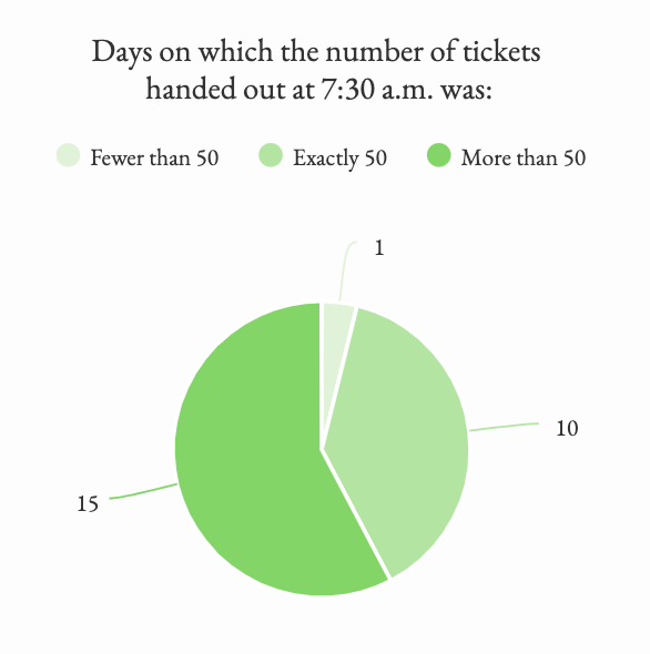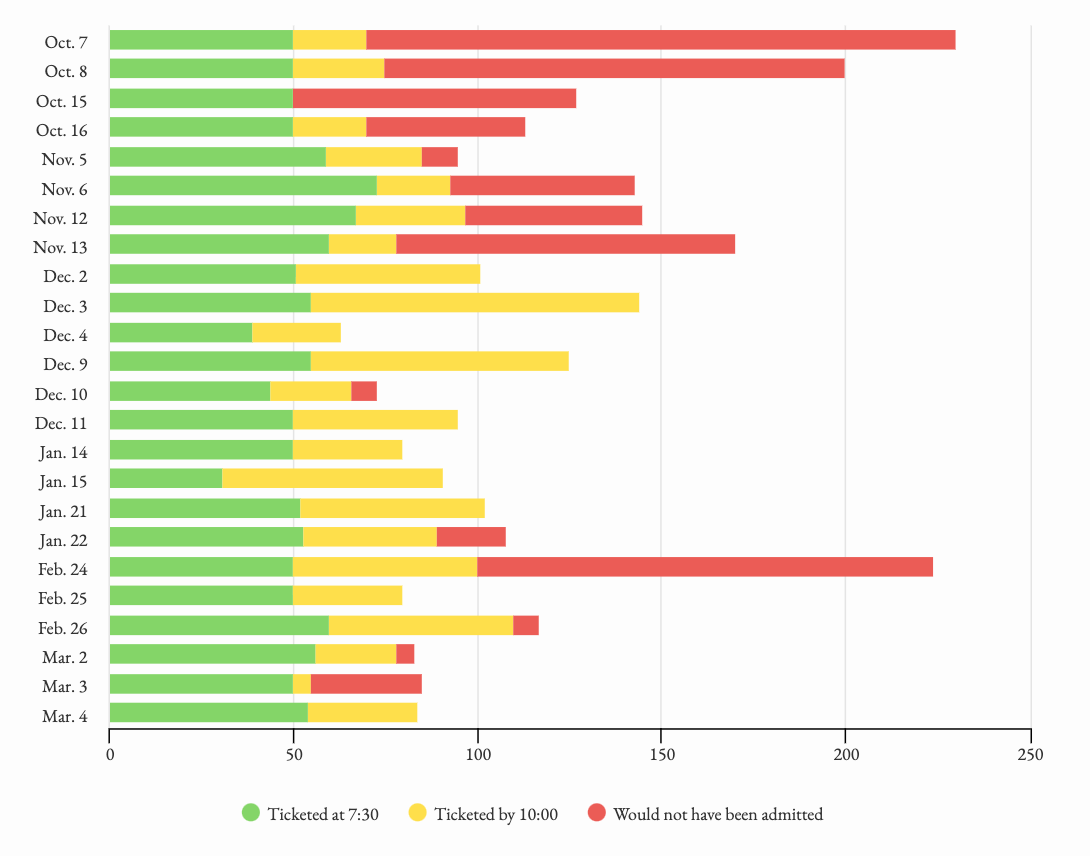 On most days, particularly in the fall, the distribution of tickets at 7:30 a.m. left many people disappointed. Over the course of the term, the median number of people who did not get tickets at 7:30 was 36. There were 10 days in total on which there were more than 50 people left outside after the tickets were distributed at 7:30. On the first day of the term, 180 people remained in line after the first set of tickets was handed out; on February 24, for the oral argument in the Appalachian Trail case, there were 174 people still in line after the 7:30 tickets were distributed. There were two other days on which there were more than 100 people in line after 7:30: October 8, for the arguments in the Title VII cases, and November 13, when the justices heard oral argument in a case involving the federal law banning racial discrimination in contracts.