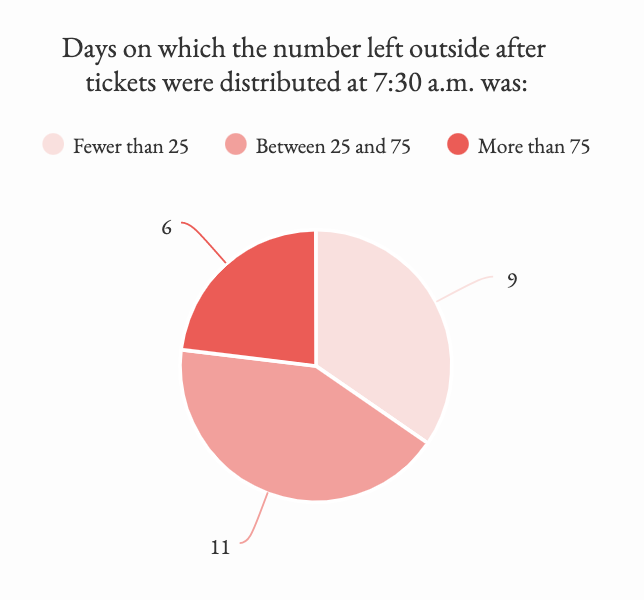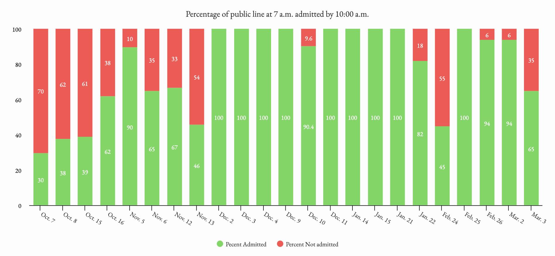 What we do know is that for many cases at the court this term, particularly the higher-profile ones, the demand for public seats outstripped the supply. On five argument days this term, more than half the people who waited in line would not get a seat. In four other cases, approximately a third of the people who waited in line ultimately would not get in for the argument. By contrast, some cases were more accessible, particularly in December and January. Even on days when there may have initially been long lines, the combination of bad weather and uncertainty about how many seats would be available may have led to some attrition: If you were willing to wait in line until 10 a.m., your chances of getting in eventually were extremely high.