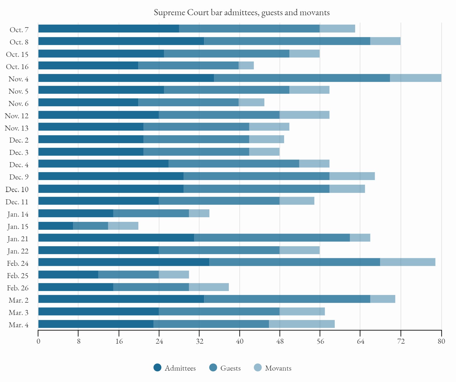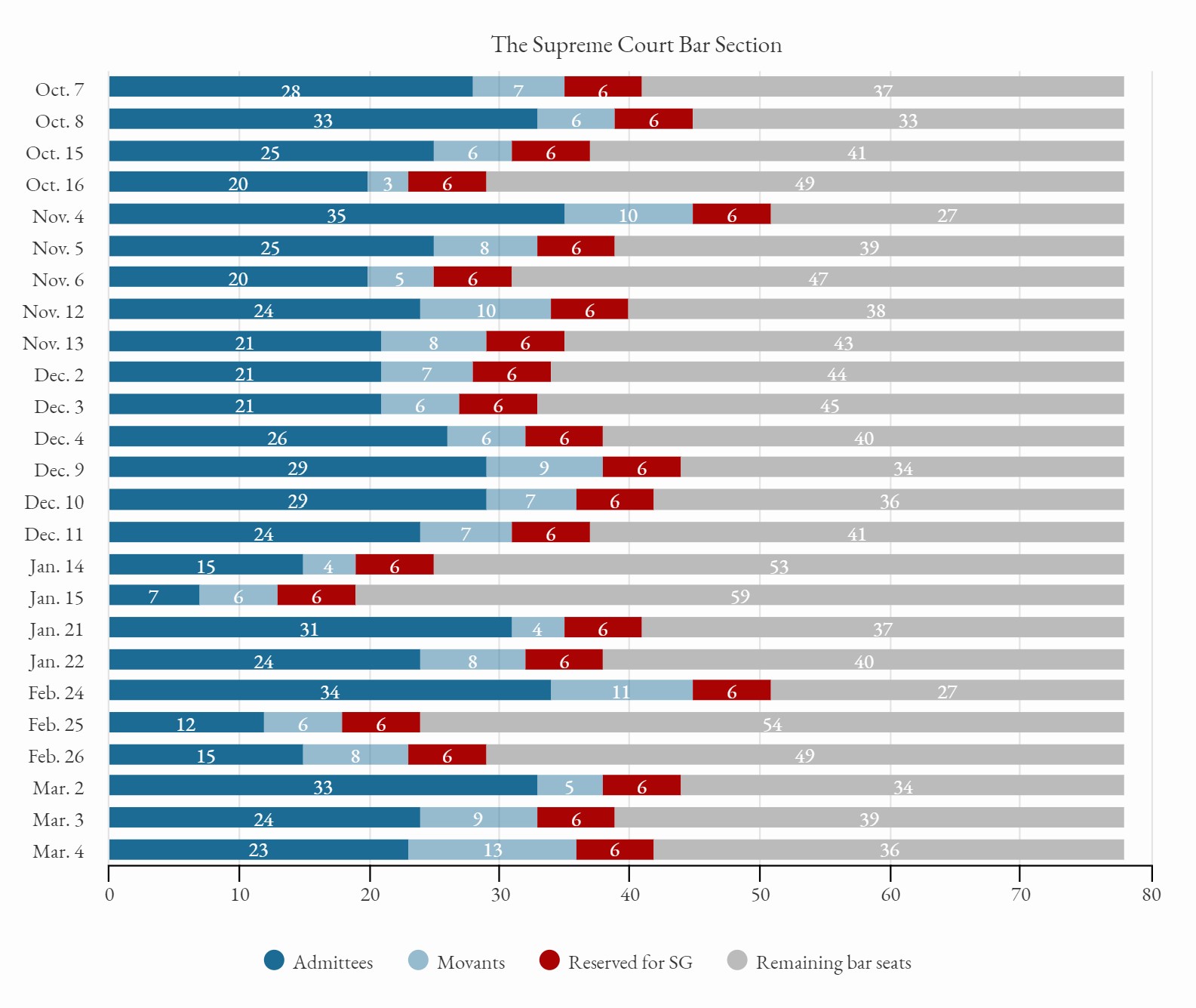 There are 78 seats reserved near the front of the courtroom, just behind the arguing attorneys, for members of the Supreme Court bar. However, on virtually all argument days, the justices also admit new lawyers to the Supreme Court bar, and these attorneys – as well as the attorneys who appear before the justices to support their admission – are also seated in the bar section without having to wait in line. Over the course of the term, the median number of seats occupied by lawyers involved in bar admissions was 32, with a maximum of 45 on February 24, when the Supreme Court heard oral argument in a case involving efforts to build a natural-gas pipeline under the Appalachian Trail. (Each attorney who is admitted to the Supreme Court bar is also allowed to bring one guest, who is seated in the public section.) Moreover, according to the court’s Public Information Office, six seats in the bar section are normally reserved for lawyers in the office of the U.S. solicitor general.