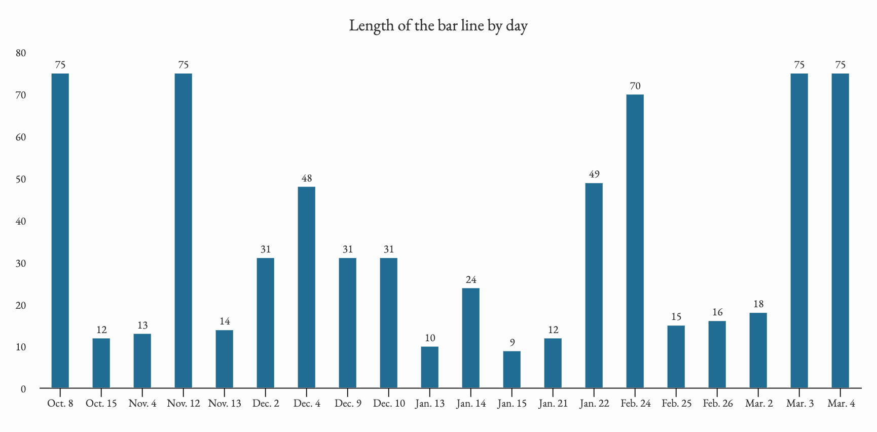 But although it isn’t easy to get a seat on such days, doing so still generally requires less effort than getting a seat in the public line. For one thing, there are fewer members of the Supreme Court bar than of the general public. Another possible explanation is that bar members are not permitted to hire line-standers to wait for them, which reduces the likelihood of a “race to the bottom”: Lawyers may not get in line as early as they otherwise would if they know that they won’t have to worry about competing with line-standers; moreover, because no one is hiring line-standers to wait for them, the line-standers aren’t arriving early to guarantee a place. Blackman, for example, arrived shortly after 3 a.m. to join the bar line for the DACA argument in November; a member of the public would have had to arrive around 8:30 a.m. the previous morning to get one of the tickets distributed at 7:30 a.m. on the morning of the argument. To get one of the public tickets distributed for the October arguments involving whether Title VII of the Civil Rights Act protects LGBT employees, you would have had to arrive nearly two days before the argument; in contrast, the bar line began to form at approximately 2 p.m. the day before the argument. And like the public line, the bar line is not always long: Beginning in December, the median number in the bar line at 9 a.m., when the court began to distribute tickets to the courtroom, was 31 people.