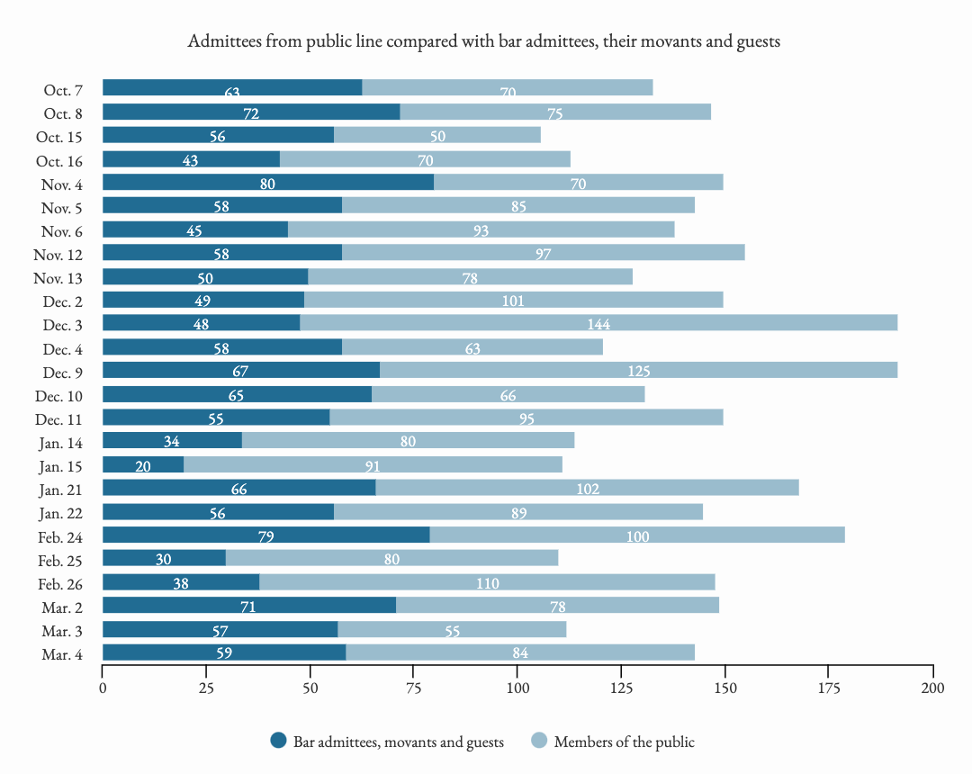 The court could address this problem in a couple of different ways, which are not mutually exclusive. First, it could allow lawyers who are being admitted to the Supreme Court bar to bring guests, but then ask the guests to leave the courtroom after bar admissions so that members of the public can take their places. Second, it could limit the number of lawyers admitted on argument days and/or try to avoid scheduling large numbers of bar admissions on high-profile argument days. To be sure, many groups arrange to have their members admitted to the bar months in advance, long before the Supreme Court schedules its oral arguments. The Supreme Court could schedule those admissions on nonargument days, when the justices take the bench to issue opinions and conduct bar admissions.