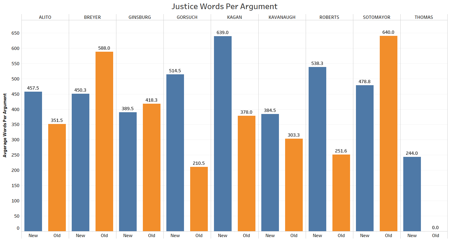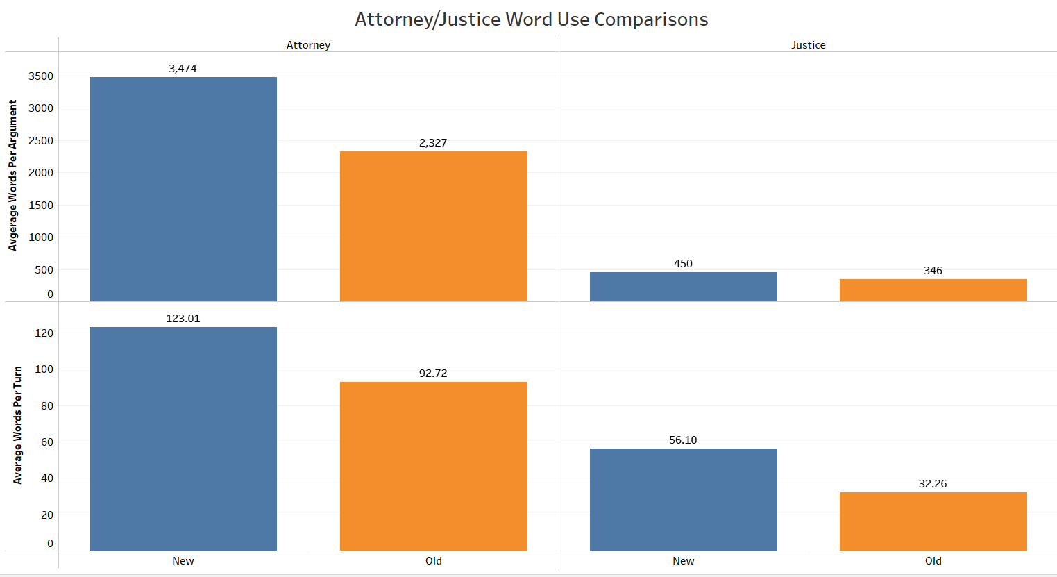 The main metrics I used to track oral argument participation across both sets of arguments were words per argument and words per turn. Both the justices and the attorneys averaged increased numbers for both measures in the new arguments. In all the charts below, the blue bars are for arguments in the newer cases and the orange bars are for arguments in the older cases.