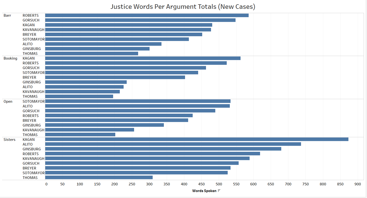 The chart below breaks down the amount of words each justice spoke in each of the four new-format arguments examined in this post.