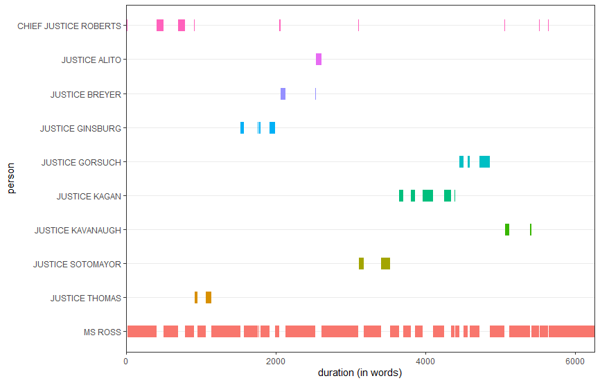 The respondent’s chart here is quite similar to the one for the petitioner’s argument in terms of the order of the questioning, with Roberts also interceding between each justice’s turn. The justices did not all speak in equal amounts to both attorneys, however. Breyer was quite voluble during Blatt’s turn and much less so during Ross’ turn. Thomas and to some extent Alito were both fairly reticent during both arguments, while Kagan and Justice Neil Gorsuch engaged both attorneys more.