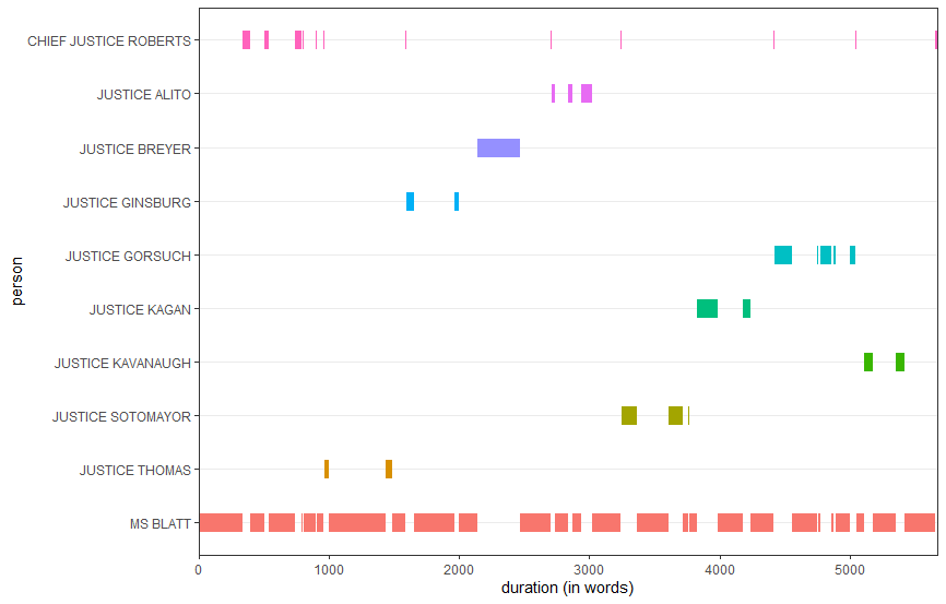 Here we see a more ordered approach, with each justice speaking in turn aside from Roberts, who jumps in to help transition between justices’ turns. Although the amounts of speech are not equal (compare the lines for Alito and Justice Elena Kagan, for example), each justice was given an uninterrupted turn with the petitioner’s attorney, Erica Ross. The same was true for the justices’ turns with the respondent’s attorney, Lisa Blatt, below.