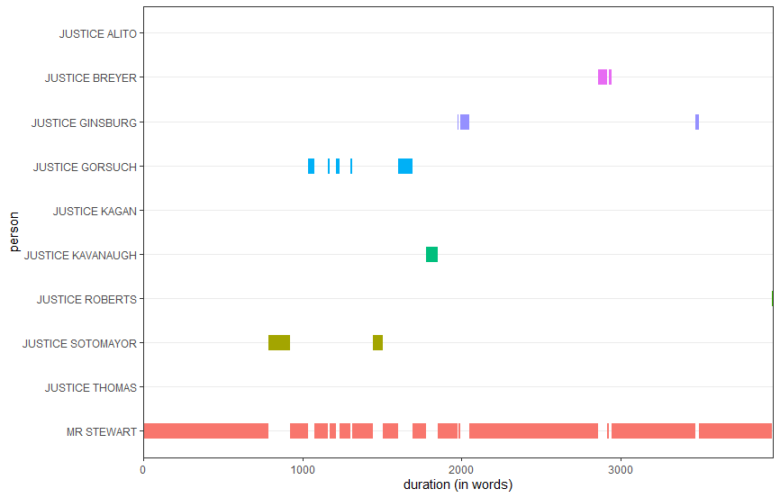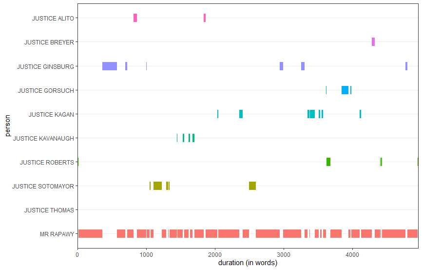 This graph indicates that there was little order to the proceedings aside from the uninterrupted opening statement by the advocate for the petitioner, Gregory Rapawy. All justices except Thomas engaged in the discussion, and all but Justice Stephen Breyer spoke at multiple points during the argument and interjected when others were speaking. This disorder allowed justices to respond to other justices’ points, but also allowed one justice to stop the attorney in the midst of responding to another justice’s question.