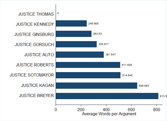Just as a note, Thomas was silent in all four arguments prior to the argument format change, and Gorsuch spoke in only two of the four older arguments. All other justices participated in each of the eight arguments except Kagan, who was recused in the Alliance for Open Society case. For the statistical analysis, Gorsuch was given zero words for the two arguments in which he did not speak, Thomas was given zero words for all four arguments in which he did not speak, and Kagan’s speech was averaged across the three telephonic arguments in which she participated, because she spoke at each.