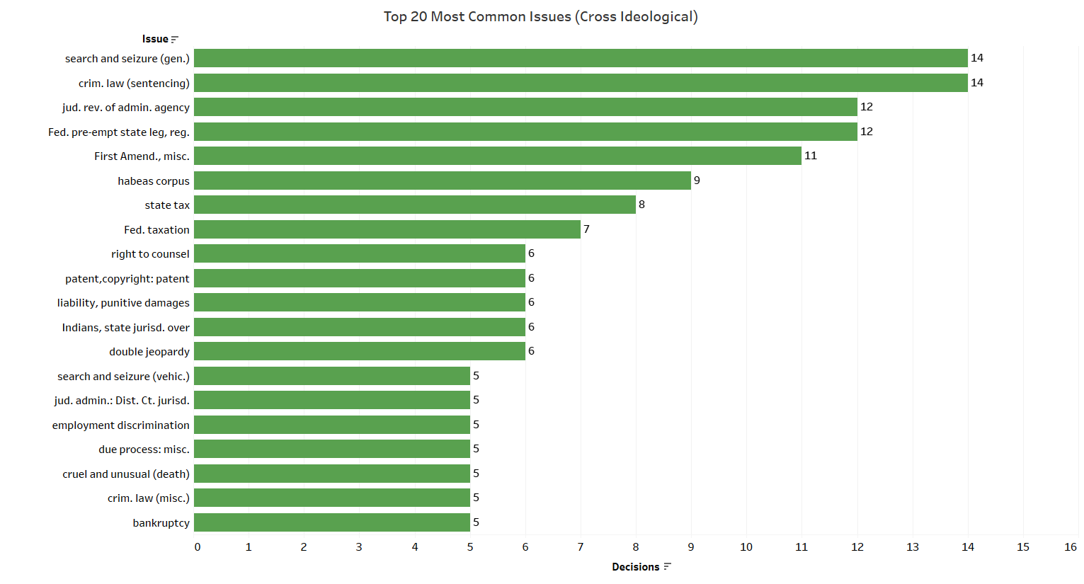 Case areas on the court’s most common issue list that are not on the cross-ideological list include: