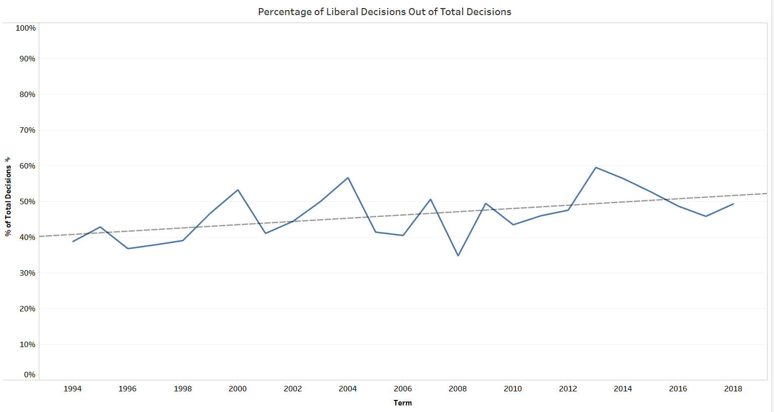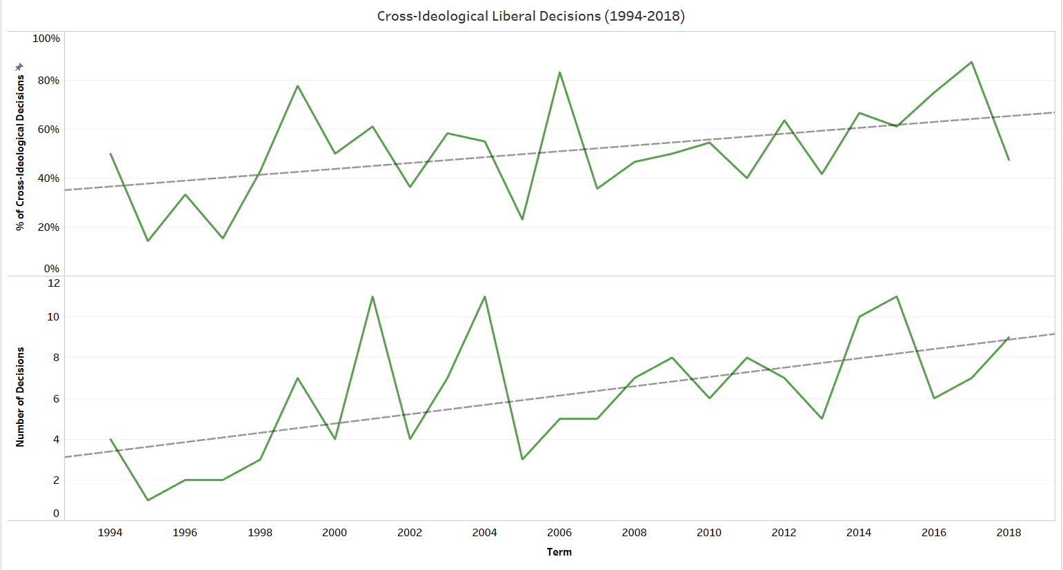Liberal decisions have been trending upward, moving from 40 percent of all decisions in 1994 to over 50 percent of decisions in 2018. This includes unanimous as well as divided decisions. Liberal decisions have increased at about double that pace among cases with cross-ideological votes, from under 40 percent of those cases in 1994 to over 60 percent in 2018.