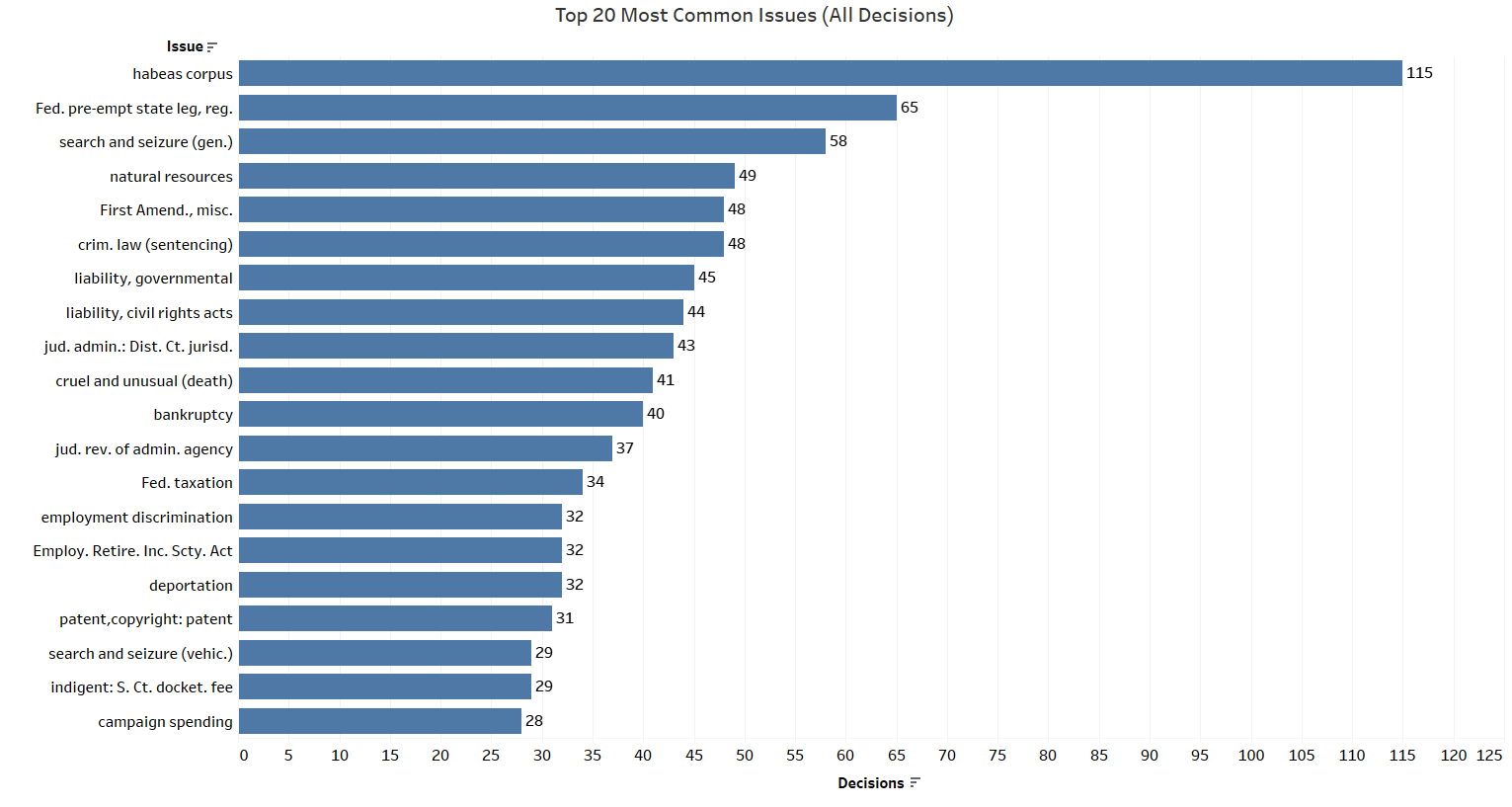 Habeas cases dominate the court’s main docket, dwarfing other issues in comparison. They are less common among cases with cross-ideological votes. Search-and-seizure and criminal sentencing cases most often produce cross-ideological votes. Both are important issues in the court’s main docket, although several issues are more dominant than criminal sentencing, including natural resources and the First Amendment.