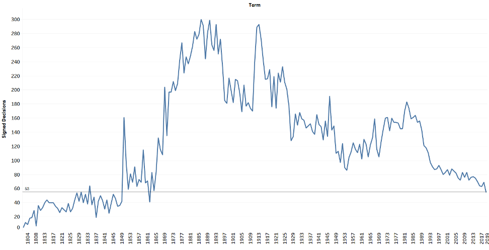 This term saw the fewest signed decisions in over 100 years. The 53 signed decisions represent the court’s lowest number since 41 in OT 1862 during the Civil War. Prior to that, you have to go back to OT 1849 to find another term with fewer than 53 signed decisions (you can find a more detailed discussion of these numbers here).