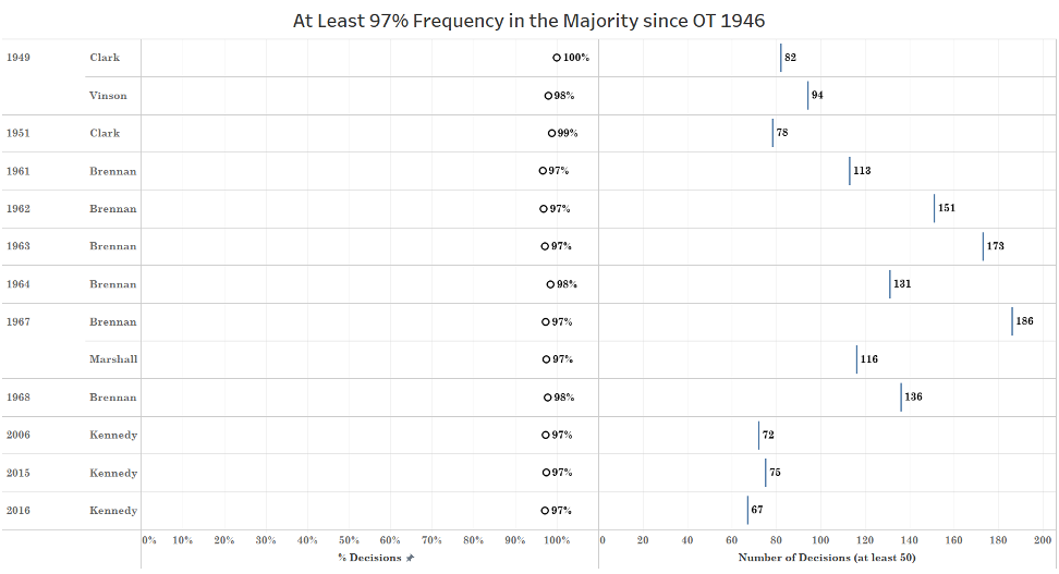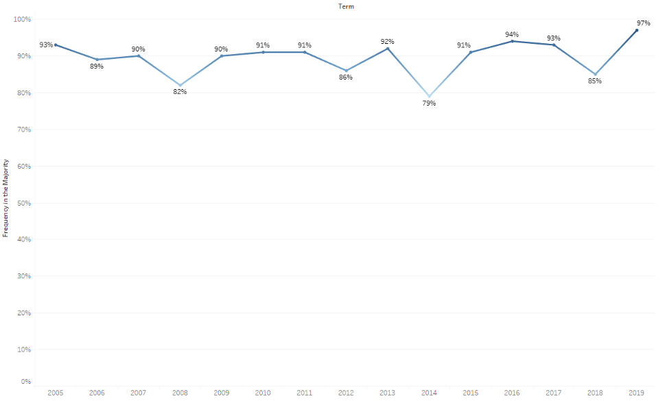 Chief Justice John Roberts was a frequent member of the court’s majority this term. He was in the majority in 97% of the term’s cases. The only other justice to decide 50 or more cases in a term and maintain such a high frequency in the majority since OT 2005, when Roberts joined the court, was Justice Anthony Kennedy (he achieved the feat three times).