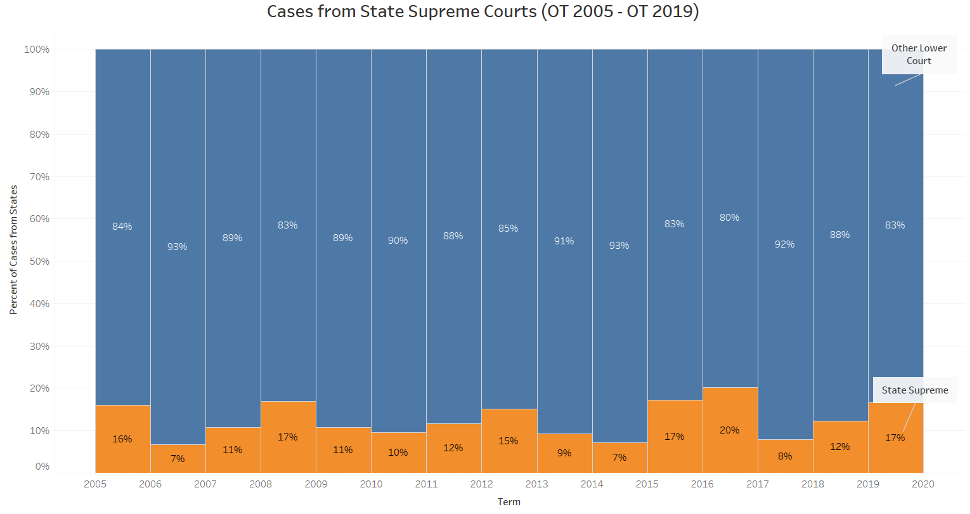 Since the beginning of the Roberts court, the percentage of SCOTUS cases from state courts has, for the most part, hovered between 10 and 20%.