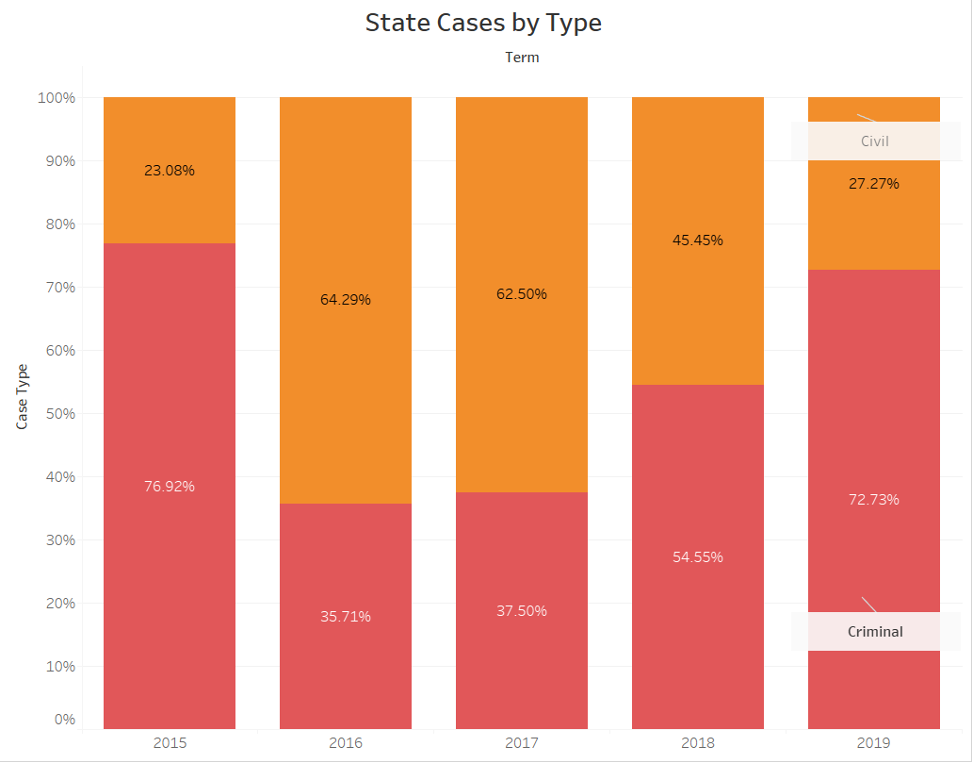 During the 2019-20 term, almost 73% of the court’s cases reviewing state court decisions were criminal rather than civil. Over the last five terms, though, there has been considerable fluctuation in this balance between criminal and civil cases coming from state courts.