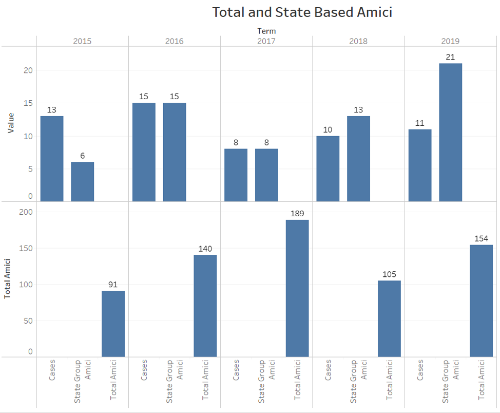 The state cases from these five terms with the most amicus filings, including the two cases mentioned above, are covered in the following graph.