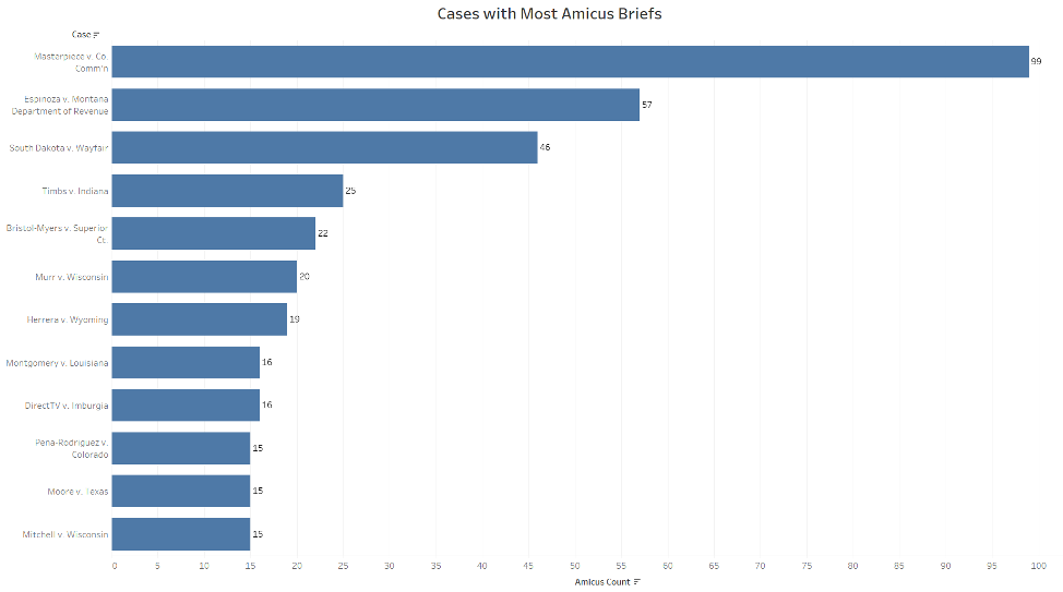 The only case from the most recent term that made the list for most amicus filings was the religious-school funding case Espinoza v. Montana Department of Revenue.