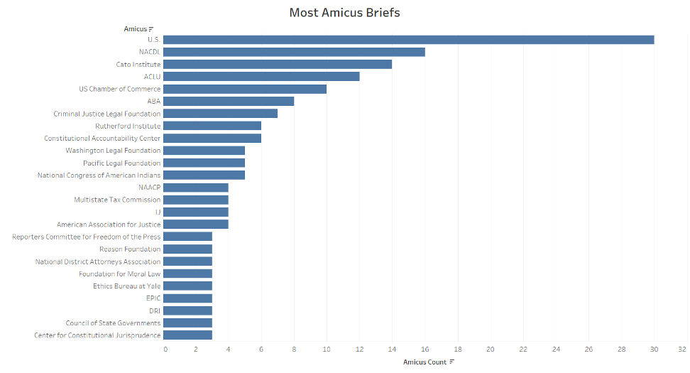 To focus on the most active amici during this period, the following graph based on entries from the Supreme Court dockets shows groups that filed amicus briefs in three or more state cases.