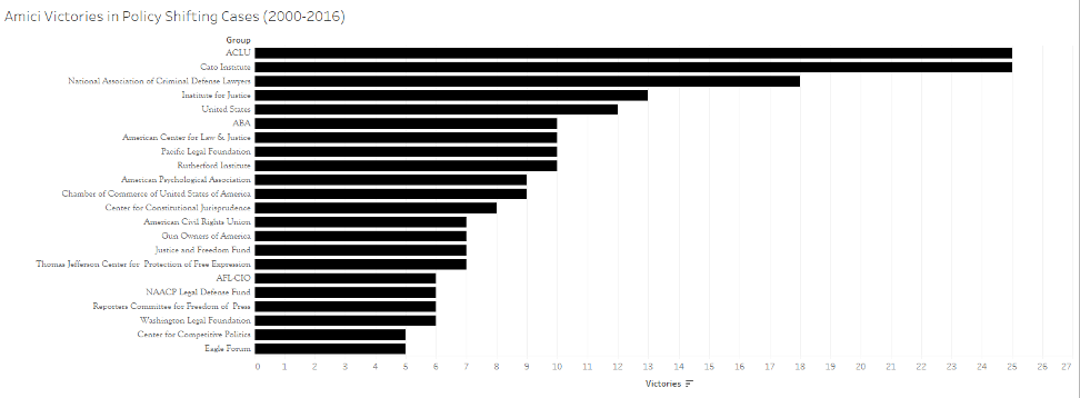 The overlap between groups in the two graphs highlights the importance of these state court cases to the most prominent amici before the court. Groups that are on the state court list but not on this list of winningest amici are those like the National Congress of American Indians, Multistate Tax Commission and Reason Foundation, which might have distinct interests in the state subset of cases.