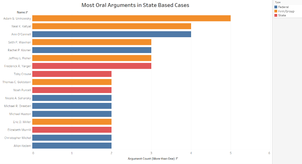 Because this post looks to nuances in state court cases that might be different from other litigation before the Supreme Court, a final measure of interest is attorneys with the most oral arguments in this set of cases. In the graph below, these attorneys are divided into private attorneys from firms or groups, attorneys for state governments and attorneys for the federal government as an amicus.