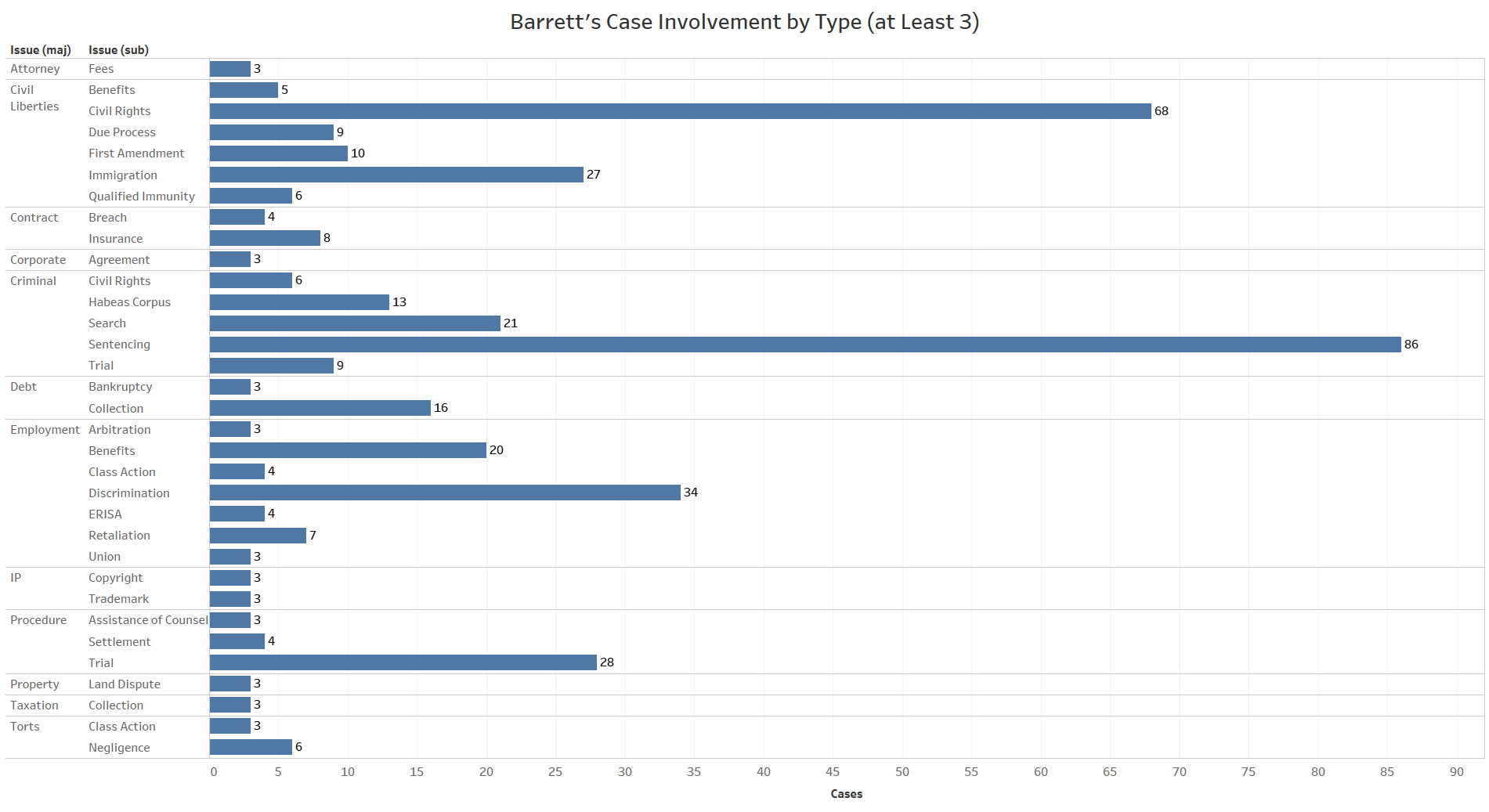 Following mainly the coding for issue area from the United States Supreme Court Database, Barrett’s cases were coded into general and specific issue areas. (A sample of 30 cases was used to test for the reliability and validity of the coding through an intercoder reliability test. Professor Jordan Carr Peterson of North Carolina State University was the second coder in this endeavor. The similarity in coding for 219 data points in this 30-case sample was 98.6%. A kappa test for intercoder agreement showed with the highest significance level that we can reject the hypothesis that coding choices were determined randomly.) The first purpose of this coding was to observe the split in case type of all of the cases that Barrett helped decide while sitting on the 7th Circuit.