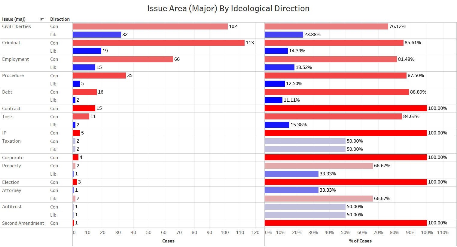 The data on Barrett’s decision making can be observed from different perspectives as well. An important way to assess how she might rule as a Supreme Court justice is by breaking down decisions into their constituent issue areas. The following figure looks at the ideological directions of Barrett’s decisions broken down by major issue area.