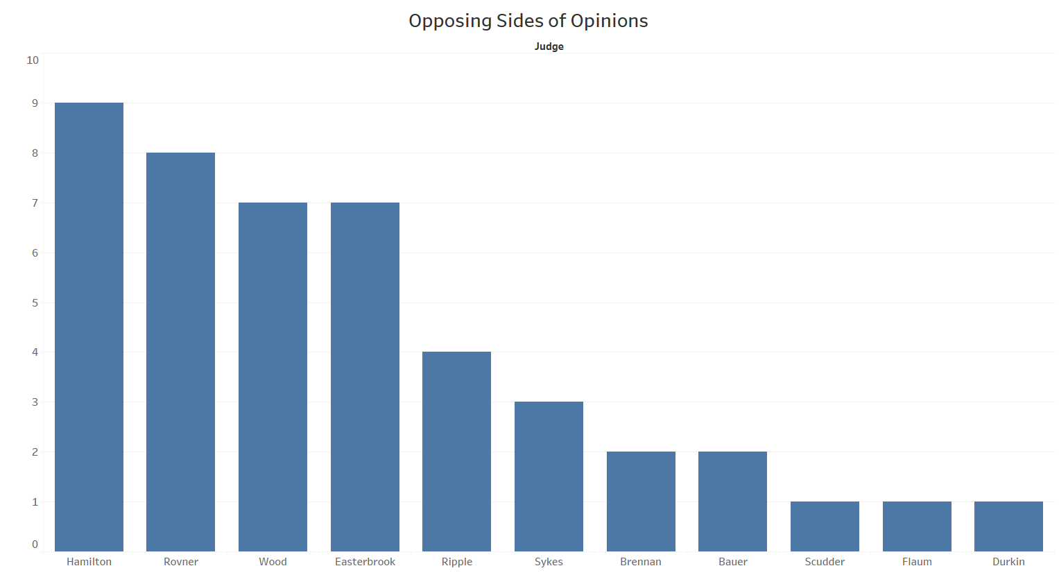 As would be expected from a Republican-nominated conservative judge, although Barrett sat on panels with Judges Diane Wood and David Hamilton — the two judges nominated by Democratic presidents — third and fifth most frequently, she disagreed with them first and third most often. Of the sitting circuit judges nominated by Republican presidents, Barrett disagreed with Ilana Rovner most often and with Michael Brennan least often.