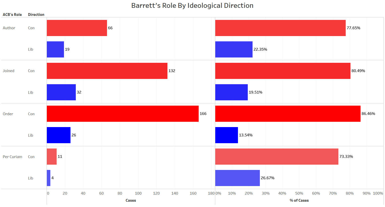We can look at Barrett’s ideology from several perspectives. One perspective is to see whether her ideology is consistent across cases in which she is the opinion author, she joins an opinion and the opinion is unsigned.