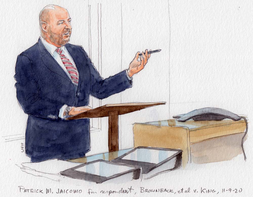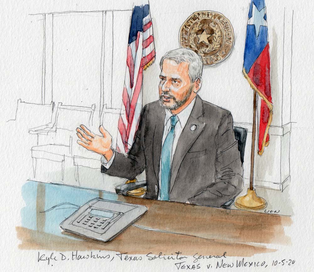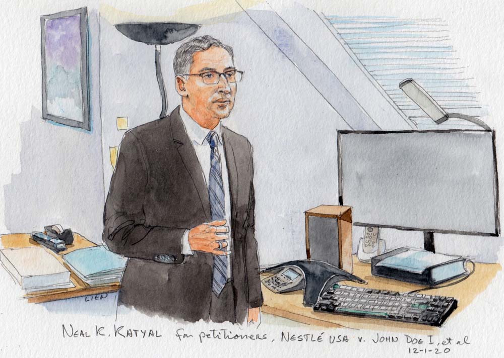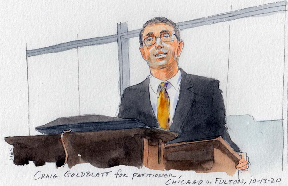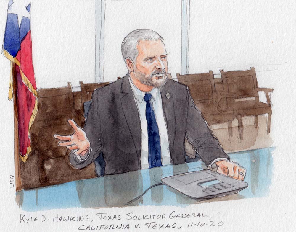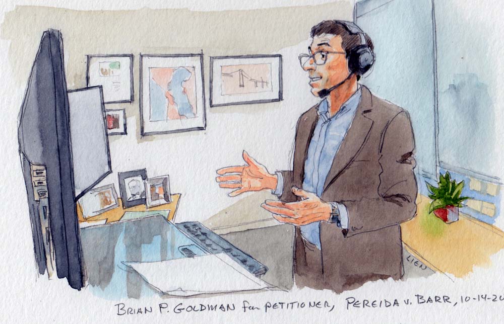 Lien changed that. Unlike when the court is open, he could not observe and draw the lawyers arguing cases in real time. So he did the next best thing. In October, at the start of the 2020-21 term, he began asking oral advocates to send photos documenting their remote arguments. He has used those photos to create illustrations in the same distinctive style that defines his live work: soft, penciled edges; a pop of color here and there; and a knack for capturing human idiosyncrasy, like a trademark gesture or a sly smile.