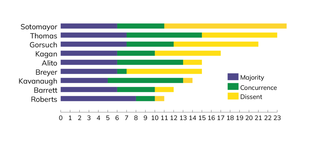 Another trend that can be gleaned from the frequencies is Justice Neil Gorsuch’s relative unpredictability. Although he is generally considered one of the three most conservative justices, he joined the liberals in dissent in several cases, penning fiery dissents in Oklahoma v. Castro-Huerta and Patel v. Garland. Gorsuch’s 75% rate of voting in the majority was the lowest rate among the conservative justices this term.