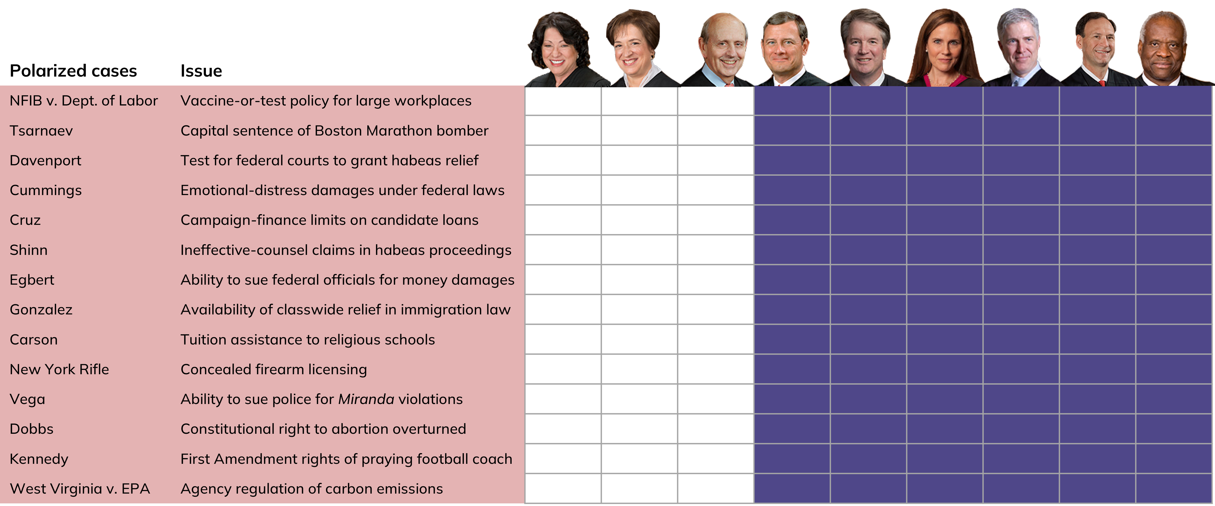 Most of those 6-3 decisions — 14 out of 19 — were polarized along ideological lines, with the six conservative justices in the majority and the three liberal justices in dissent. Most notably, the six conservatives voted as a bloc to broaden Second Amendment rights, expand the role of religion in public life, and limit the Environmental Protection Agency’s authority to regulate carbon emissions. (The six conservatives also were in the majority in Dobbs v. Jackson Women’s Health Organization, though one of them — Chief Justice John Roberts — wrote that he preferred a narrower result and would not have overturned Roe v. Wade.) And in other lower-profile but highly consequential decisions, the conservatives voted together to strike down a campaign-finance law, restrict relief for prisoners challenging their convictions, and limit the ability of citizens to sue police officers and federal agents for alleged constitutional violations.