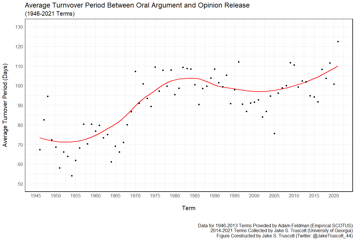 So, why the delay? The combination of procedures dictated by internal norms and the court’s preference to maintain confidentiality leaves scholars to construct inferences about the court’s practices based largely on anecdotal evidence, usually from former clerks, justices, or other insiders. In fact, many of the inferences concerning how the court actually operates behind the scenes are drawn from the archived notes of Justices Harry Blackmun and Lewis Powell. Both of those justices, however, served primarily in the 1970s and 1980s, so their relevance to modern practice may be limited. In effect, the leaked Dobbs draft represents the first indication that even the most notable and lengthy opinions are completed rather quickly, and the long interlude might be the result of responding to lengthy separate opinions or other behind-the-scenes maneuvering. It is perhaps unsurprising then that there is a notable correlation between the diminishing size of majority coalitions and a discernable increase in opinion length.