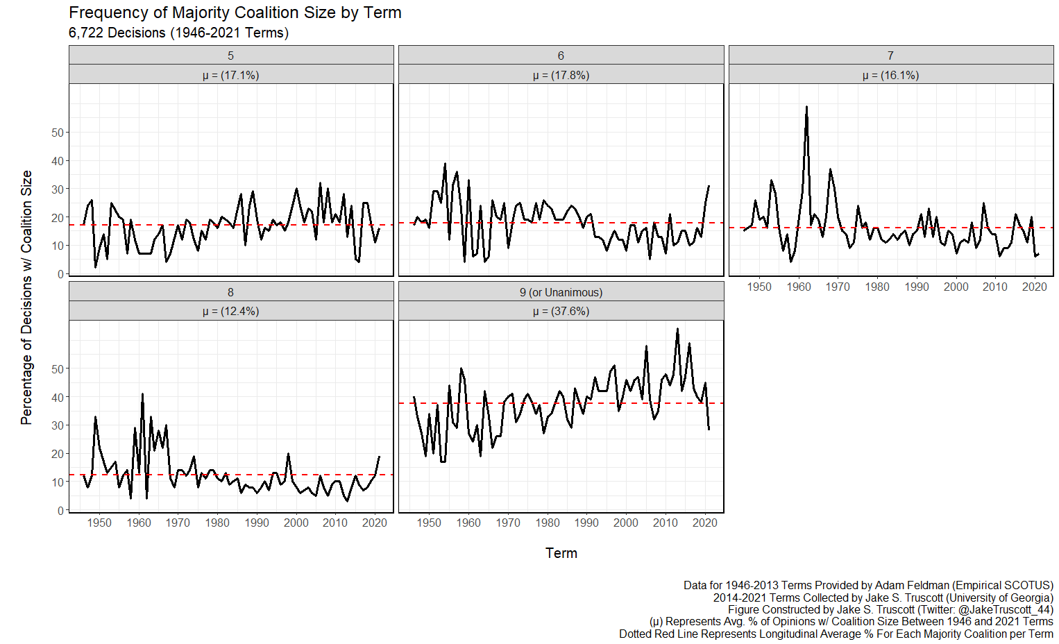 These observations are not a new phenomenon. Ideological conflicts have existed throughout the court’s history and became increasingly clear in the early 1900s. Long opinions are frequently found in more divisive cases. An emerging trend in recent years, however, is the shrinking volume of unanimous decisions in coordination with an apparent willingness of the court to grant review to generational political issues. Incorporating this term with the historical record, we can see how only two majority coalition sizes, 8-1 and 6-3, are both increasing and currently above their historical averages. The percentage of unanimous decisions in the 2021-22 term was also well below the 75-year average of 37.6%.