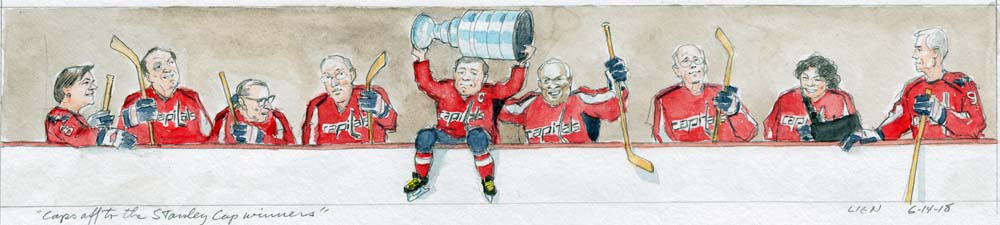 In recent years, I was honored that Art asked me to help him conceptualize some of those banners, such as when the Washington Capitals won the Stanley Cup. Art depicted the justices in full hockey gear, with Roberts hoisting the cup. (I had suggested that Justice Ruth Bader Ginsburg be outfitted in full goalie gear, but Art told me he was too far along with his sketch by that time.) When the Washington Nationals won the World Series in 2019, Art did agree with me that Ginsburg should be shown in a “Baby Shark” costume that some Nationals fans had taken to wearing during the series.