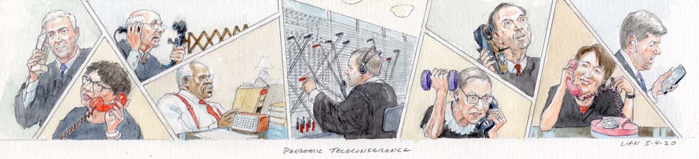 On the wall of my office, in prized space above my desk, I’ve hung a framed, signed copy of Art Lien’s brilliant “Pandemic Teleconference.” Every detail is perfect: the chief at the old-fashioned switchboard; RBG lifting a weight in one hand, the phone in the other; Alito on shoe phone; Thomas with a copy of the US Reports; Kagan twirling the cord of a pink princess phone. Art’s creative talent, canny observation and whimsy come through in all nine panels. I’m never taking the piece down, and I will remember Art Lien. All the best in retirement, Art.