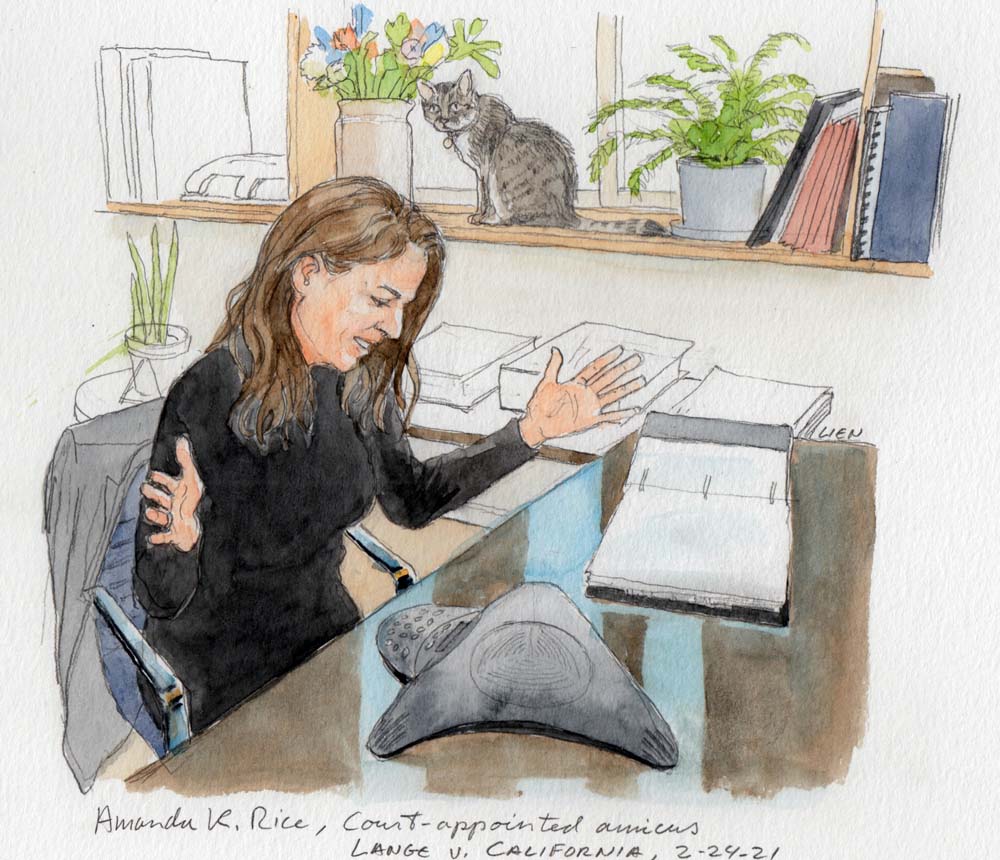 When the justices pivoted to holding oral argument by telephone because of the COVID-19 pandemic, Art was ready. Art asked the arguing lawyers to send him pictures of their oral argument set-ups, and the vast majority of them agreed. The series of sketches that followed was in a sense a metaphor for the pandemic itself. Instead of standing at a lectern before the justices, dozens of lawyers argued alone (or, sometimes joined by students wearing masks), but with very different approaches: Some dressed formally and stood at their own lectern, while others wore hoodies and sat at a table. And at least one lawyer, we saw, argued from her home office, with her cat perched on a nearby shelf.
