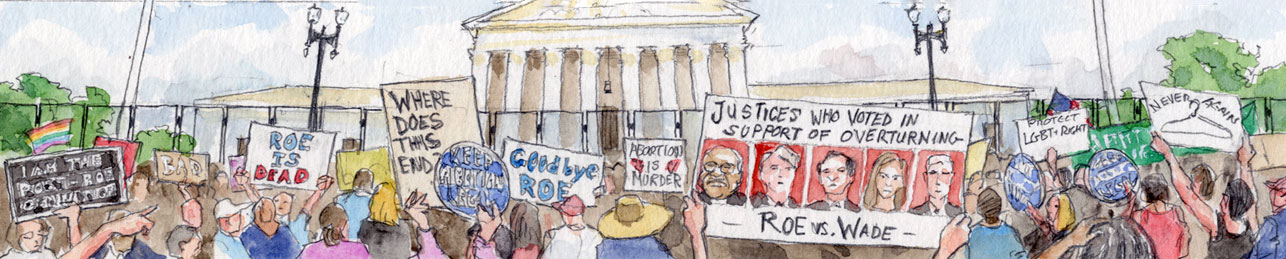Even the most casual readers of SCOTUSblog are familiar with Art’s banners – the sketches that grace the top of the site every day. Although the banners may have been originally intended as a simple way to add some visual interest to a homepage packed with text, they quickly became so much more than that, often keeping readers up to date on the weather and events outside the court, depicting everything from Washington’s famous cherry blossoms and police officers standing in the rain to the barricades that surrounded the court after the Jan. 6, 2021, insurrection and the abortion protests in 2022.
