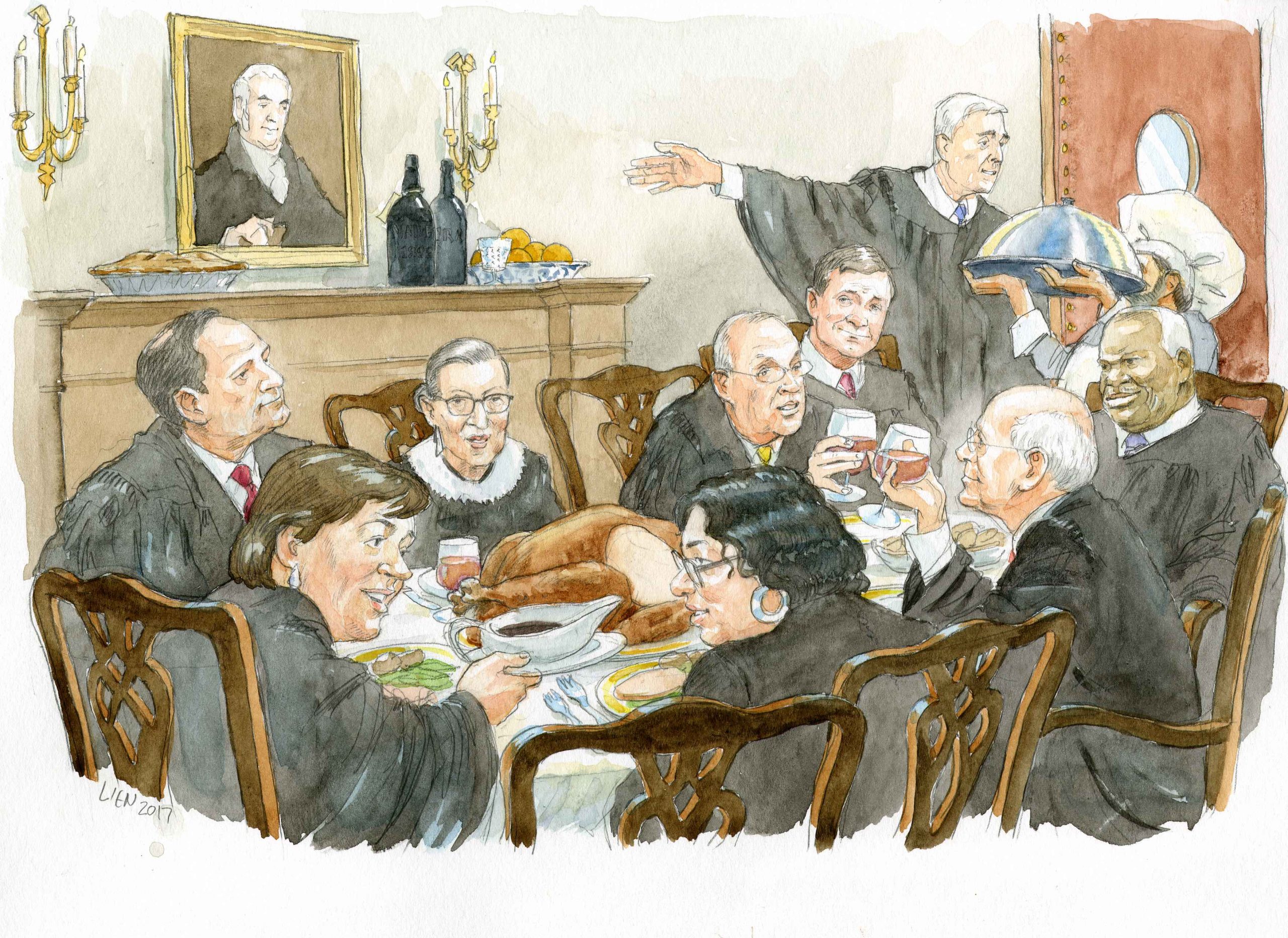 He also is keenly aware of the subtle nuances of changes to procedures and customs at the Marble Palace and captures small, telling details with his brush. Often with a wink of humor or a sigh of emotion. When I asked him to draw a fanciful scene of the justices having lunch for my book Table for 9, to show their efforts at cordiality around breaking bread together, he outdid himself. In addition to perfect renderings of the justices enjoying a Thanksgiving meal, he added Justice Neil Gorsuch (who was at the time the junior justice) opening the door for the chef to bring in the turkey. And he drew a portrait of John Marshall over the mantelpiece and a bottle of Madeira to give a nod to the boarding-house traditions established by that chief justice. Delightful.