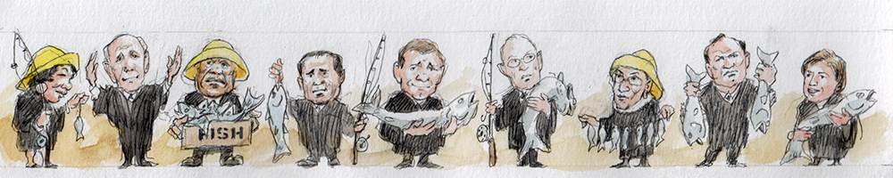 Other banners took a more whimsical approach, showing the justices in various costumes. Sometimes Art’s inspiration for the banners came from the cases being argued before the court. When the justices heard oral argument in Yates v. United States – a fisherman’s challenge to his conviction for violating a federal law prohibiting the destruction of evidence, which in his case was fish that were smaller than the legal limit – Art sketched each of the justices as a fisherman, dressed in foul-weather gear and displaying their catches (or, for Justice Stephen Breyer, the lack thereof). And when Washington’s hometown hockey team won the Stanley Cup, Art commemorated the occasion with a banner showing the justices dressed as hockey players, with Chief Justice John Roberts hoisting the cup above his head.
