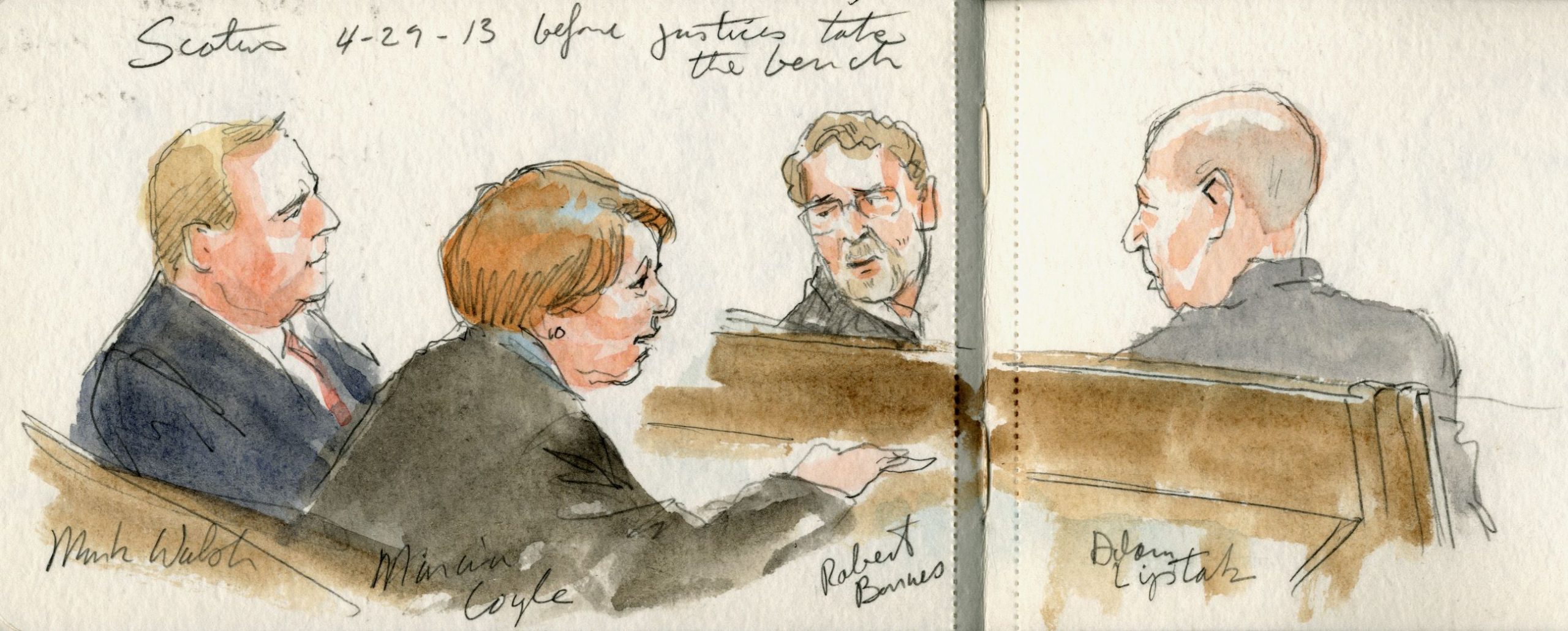 When I would get a seat in one of the first two rows of the press section, I quickly learned that I risked a cameo appearance in one of his sketches. Art would often draw the sides or backs of the heads of the correspondents who were in his line of sight as he captured the lawyers arguing cases or the justices asking questions. I learned to try to take a seat a little to his right, just out of his sightline to the bench, but still close enough to chat with him before arguments.