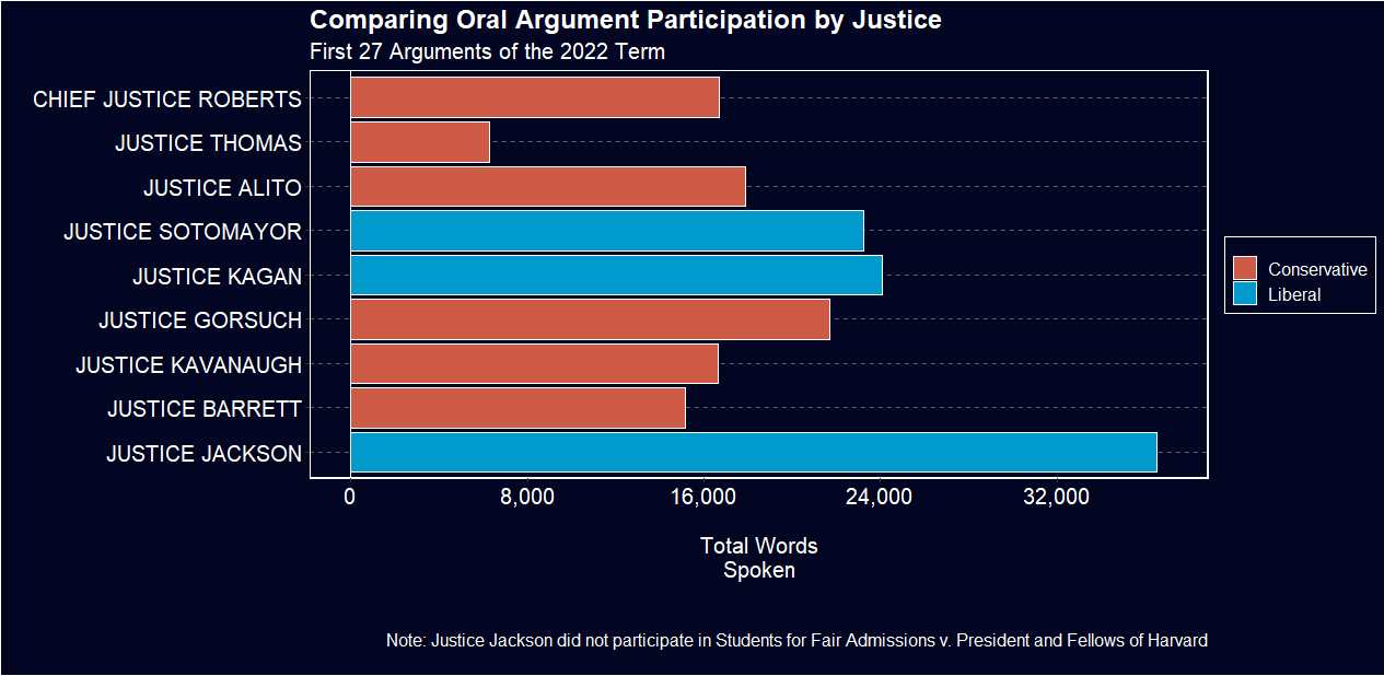 This graph shows that she has spoken a staggering 36,500 words, which is nearly 12,000 more than the justice with the next most words (Kagan) and is almost 30,000 more than the justice with the fewest words so far (Thomas). This is even more striking since Jackson recused herself from the other affirmative-action case, Students for Fair Admissions v. President & Fellows of Harvard College.