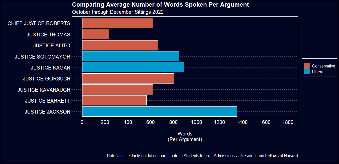 The graph below shows that Jackson is well out in front of her colleagues in terms of words spoken per argument. It also shows that the court’s liberal bloc — Jackson, Kagan, and Sotomayor — makes up the top three slots on this measure.