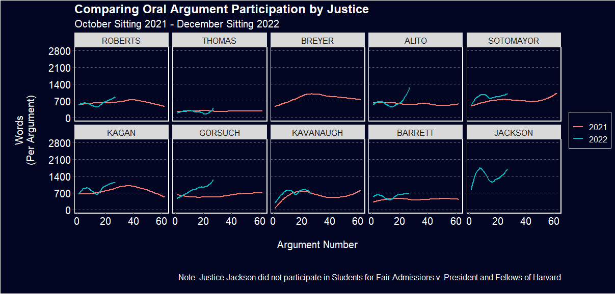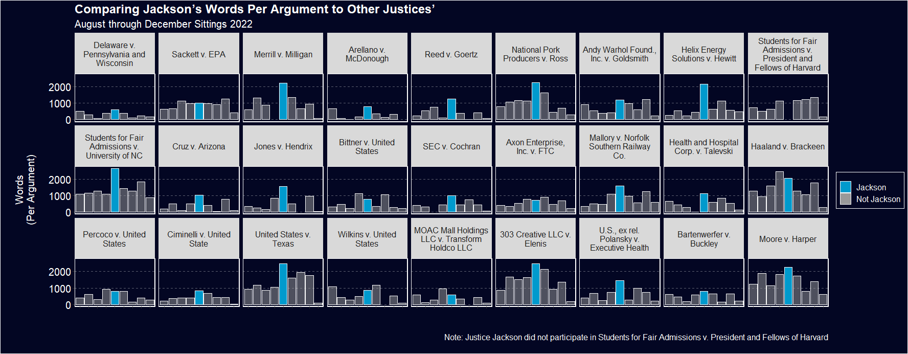 We also see that not only is Jackson outpacing the other justices in words spoken, but her word counts are significantly greater than Breyer’s from one term ago — and Breyer was not known for his succinctness.