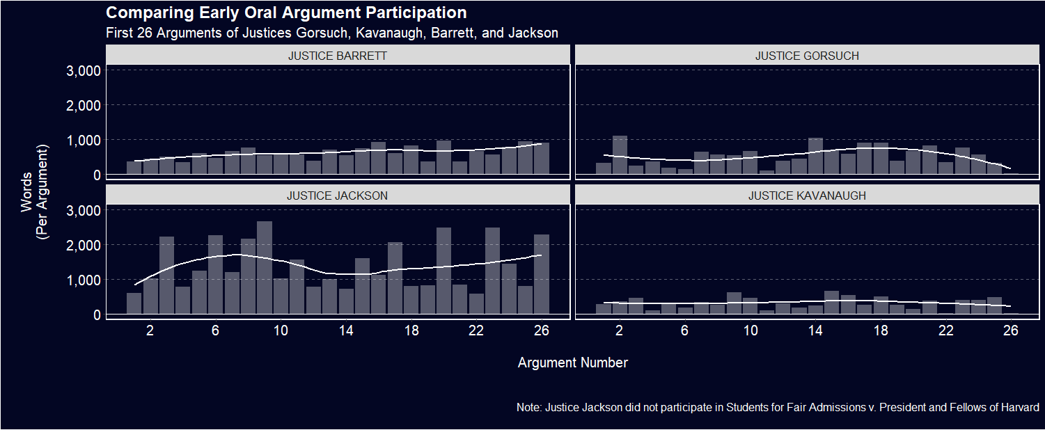 None of these other new justices are even in the same ballpark as Jackson. It is important to note, however, that the disparity is probably explained in part by the fact that Jackson joined the bench under the court’s new argument format. Gorsuch and Kavanaugh’s first arguments were conducted under the old format, in which most arguments were capped at one hour, so the justices did not have the chance to speak as many words as they do now. Barrett’s first arguments were during the early part of the pandemic when the court was hearing arguments over the phone.
