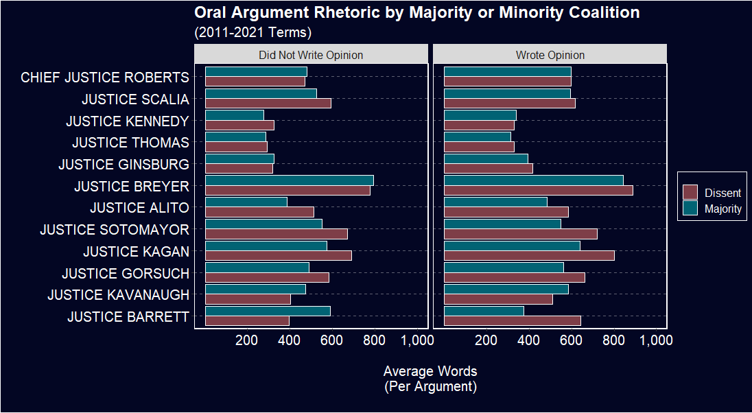 With Jackson’s impact on oral arguments thus far, one might wonder whether a justice’s level of engagement at an argument can indicate whether that justice is more likely to write the majority opinion or a dissent in the case. Based on our analysis of argument word counts from the past decade, the answer seems to be no.